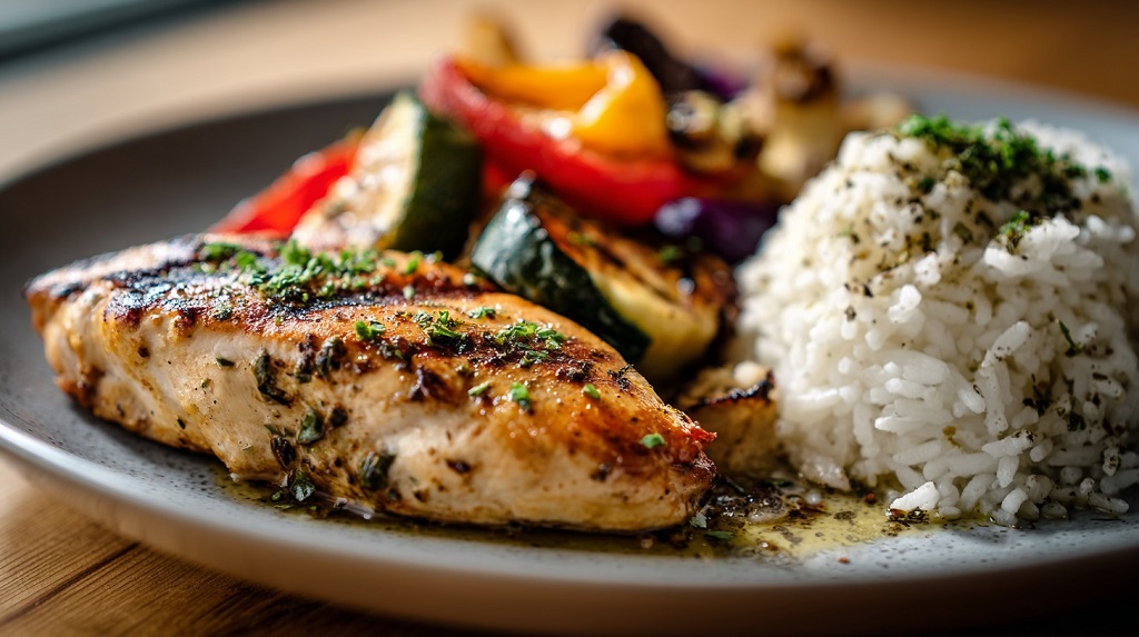 - Chicken, rice, roasted vegetables, olive oil