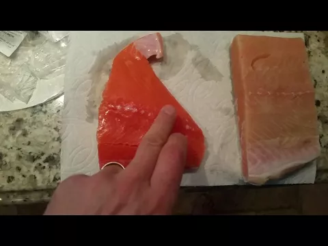 Fresh salmon varies naturally in hue, from coral pink in Atlantic species to deep orange in wild Pacific types. A dull surface, brown patches, or an overall gray tint means the flesh is breaking down.